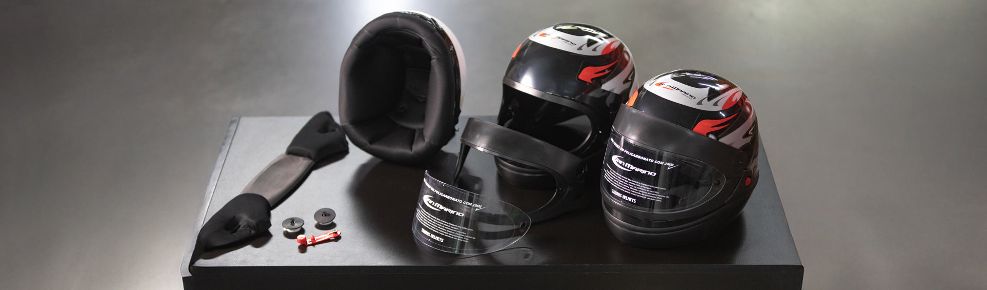 Viseiras de lentes diversas, palas, kits de mecanismo de viseira e mais.